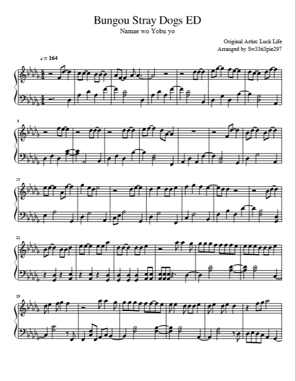 Namae wo Yobu yo – Bungou Stray Dogs Ending sheet music ...